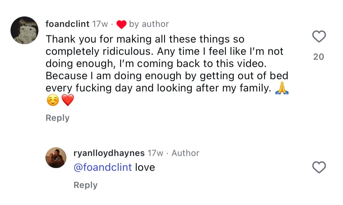 During our interview for the MOMT pod, Ryan referred to this video as “Silly.” “Silly?” I thought. Sure, it’s tongue in cheek, but comments like the above are far from silly. They’re shifts in mindsets. They’re alleviated anxiety. They’re lost perspectives back with their rightful owners. But shortly after this conversation I got to understand what he was really saying once he’d posted another monolog-y video. Equally tactically astute. Equally weighty with words. But this time a deeper, more systematic, personal yet wide reaching subject matter.